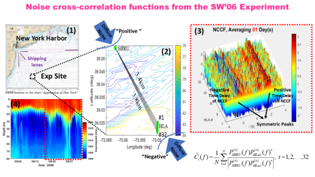 Abstract: In a wide range of frequencies spanning from below 1 mHz to hundreds of kHz and encompassing acoustic, gravity, and infragravity waves, ocean waves create pressure fluctuations, which can be harnessed to interrogate the ocean and measure physical parameters of the water column, ice cover, and the seabed. Noise interferometry replaces signals due to a powerful, compact wave source with averaging extensive datasets comprising contributions of multiple spatially distributed random sources. By cross-correlating the pressure or particle acceleration fluctuations at different locations, interferometry of diffuse noise retrieves approximations to Green’s functions of various waves, which then serve as the input data for passive ocean remote sensing. The success of seismic interferometry is well documented. Achievements of acoustic noise interferometry are more modest but include passive measurements of current velocity in the Straits of Florida, acoustic thermometry of the ocean, passive acoustic tomography of the water column, characterization of the geoacoustic parameters of the seabed at various sites, and characterization of the sound speed profile variations on sub-seasonal time scales on continental shelf.